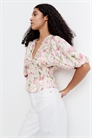Короткая блузка из тканого материала с глубоким V-образным вырезом и короткими рукавами-баллончиками с потайной резинкой на манжетах. Узкие ряды эластичной резинки на талии и подол со складками.