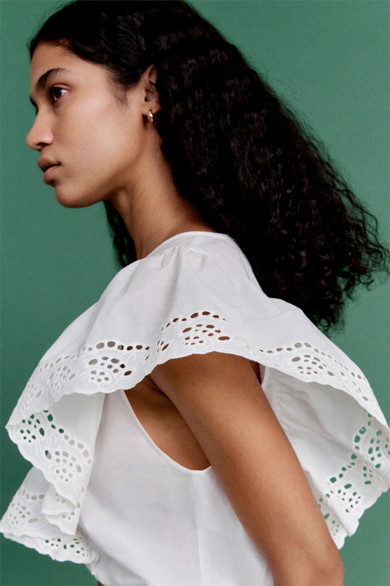 Блузка из воздушного хлопкового полотна с отделкой из бродери-англизе. Круглый вырез с замочной скважиной и потайной пуговицей сзади, короткие рукава с воланами.