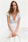 Короткая приталенная блузка воздушного плетения из смеси льна и вискозы. Она имеет глубокий V-образный вырез с накладкой по центру бюста, рукава-воланчики и пояс, который пришит спереди и завязывается сзади, создавая расклешенный пеплум.