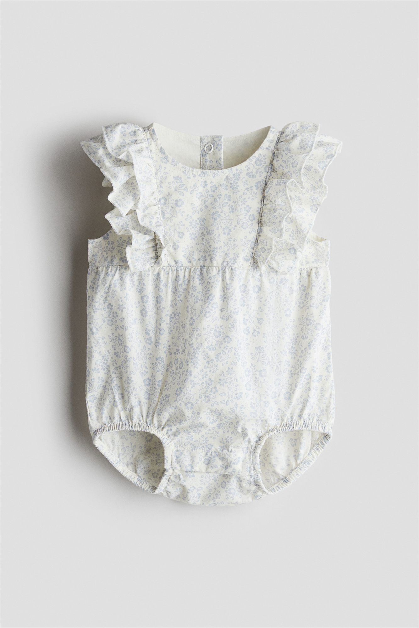 Костюм-ромпер без рукавов из мягкого хлопкового полотна с принтом на всю длину. Круглый вырез, узкий вырез спереди с декоративными оборками, переходящими на плечи, и пройма с застежками на кнопки сзади. Узкая эластичная резинка вокруг ног и потайные кнопки внизу для удобства переодевания. Подкладка в верхней части.