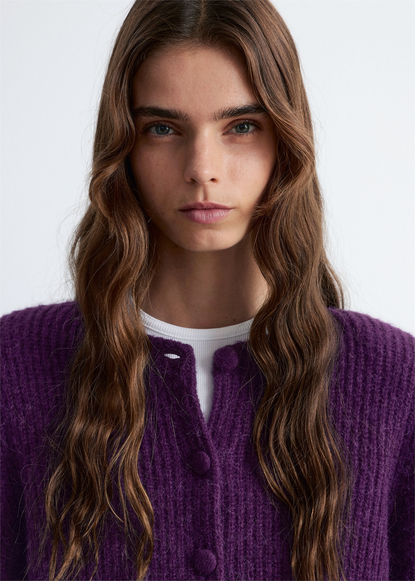 Этот кардиган связан из мягкой смеси шерсти мериноса и альпаки в рубчик. Модель имеет круглый вырез, длинные рукава и небольшие карманы спереди. Легкие подплечники придают модели мягкую структуру, а тональные трикотажные пуговицы создают чистый, обтекаемый образ. Надевайте поверх футболок и танкеток. 39% RWS Wool TE-00047206 35% RAS Alpaca TE-00047206 Длина кардигана: 52 см / 20,5" (размер S)