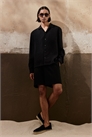 Рубашка из воздушного фактурного полотна с курортным воротником, французским передом, перекрещивающимися сзади складками и длинными рукавами с манжетами на пуговицах и рукавной застежкой. Подол прямого кроя. Регулярный крой для комфортной носки и классического силуэта.