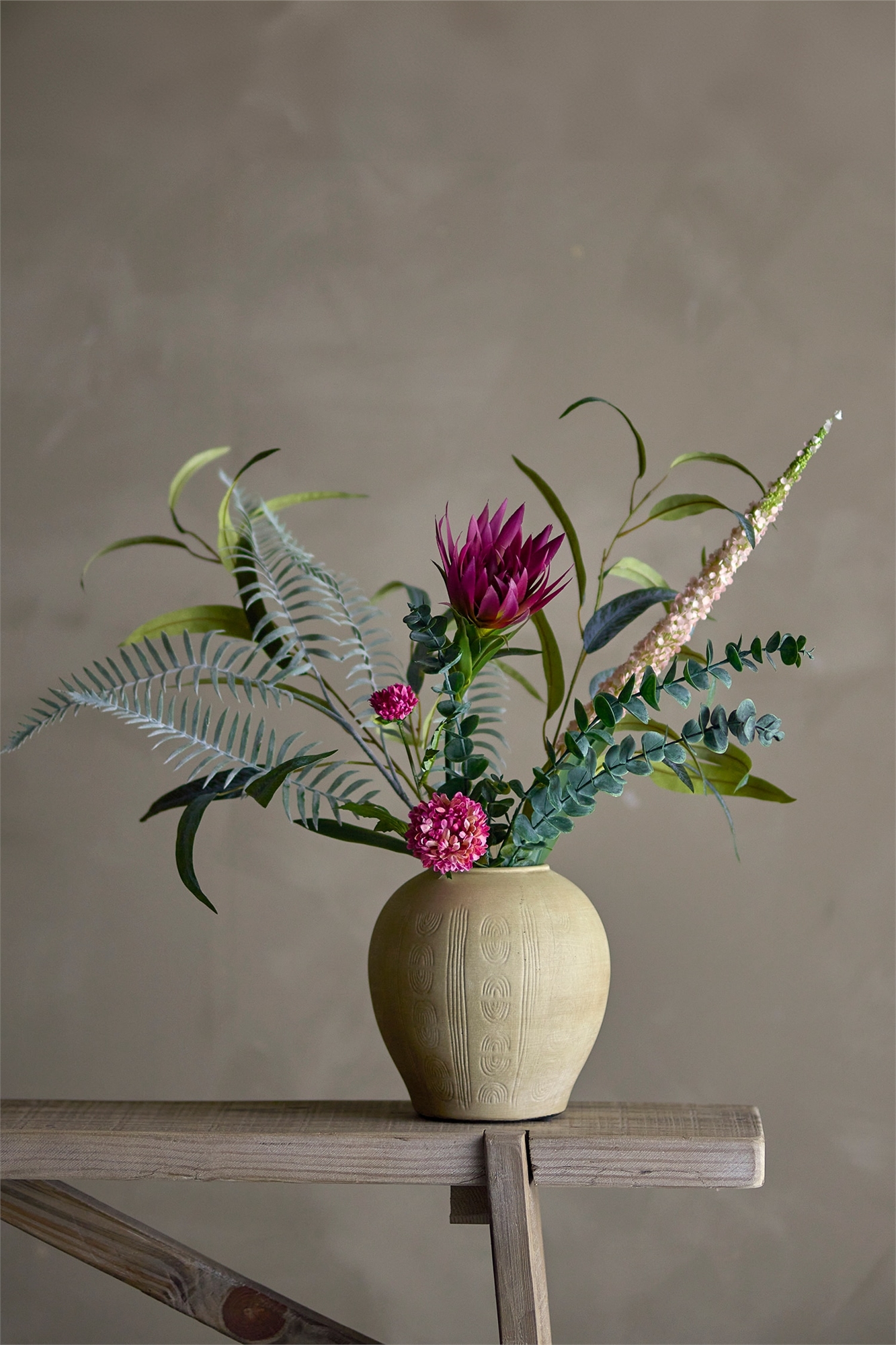 Искусственный букет "Корона" от Bloomingville выделяется яркими оттенками фиолетового и темно-зеленого. Тщательно подобранная композиция имеет почти царственный вид, напоминая корону, а каждый цветок вносит свой вклад в величественный общий вид. Этот букет - идеальный центральный элемент для элегантных встреч и особых случаев, а также настоящее торжество ботанической красоты, призванное произвести неизгладимое впечатление. Обрежьте и придайте стеблям форму перед использованием, чтобы подчеркнуть естественный вид букета и придать ему индивидуальный декор. Завернут в бумагу. Ваза в комплект не входит. D30xH80 см.