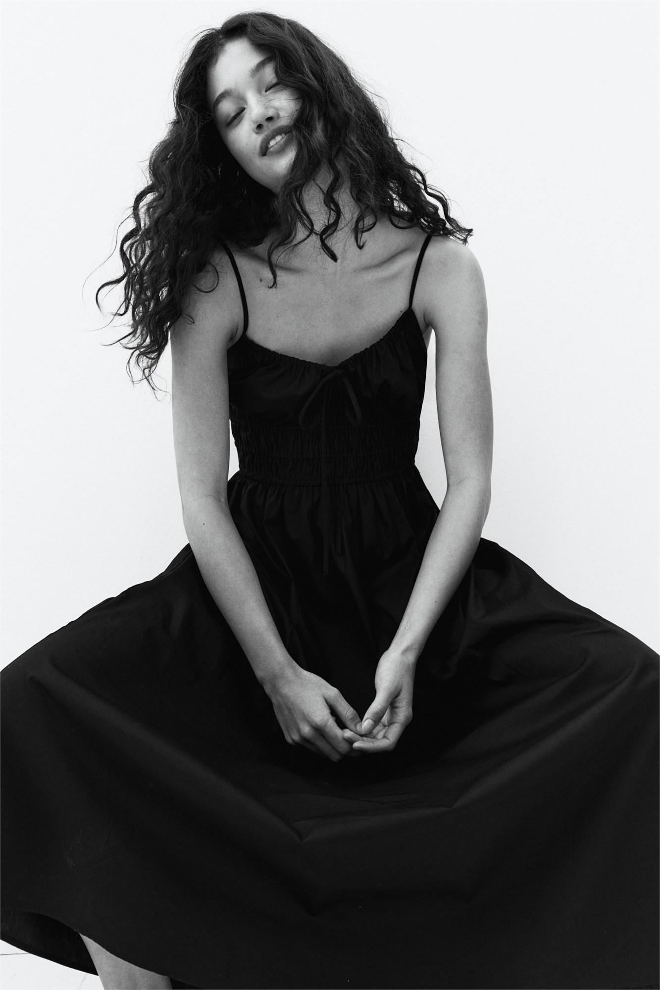 Платье длиной до щиколоток из воздушного хлопкового полотна с эластичным V-образным вырезом с узкими завязками спереди и регулируемыми бретелями-спагетти. Завязки на талии и расклешенная юбка. Без подкладки.