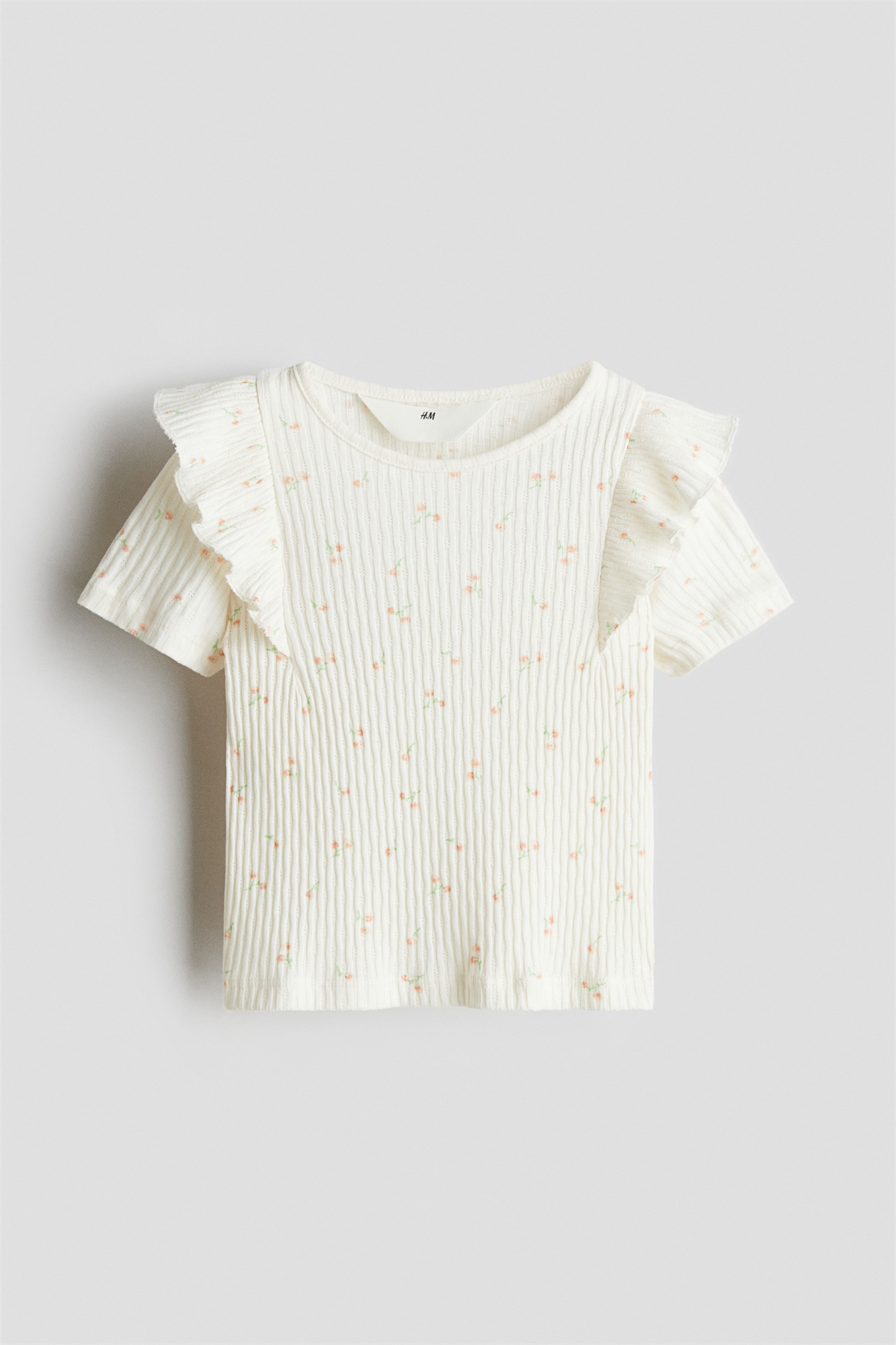 Топ с короткими рукавами из мягкого, ребристого хлопкового джерси с круглым вырезом и воланами на плечах.