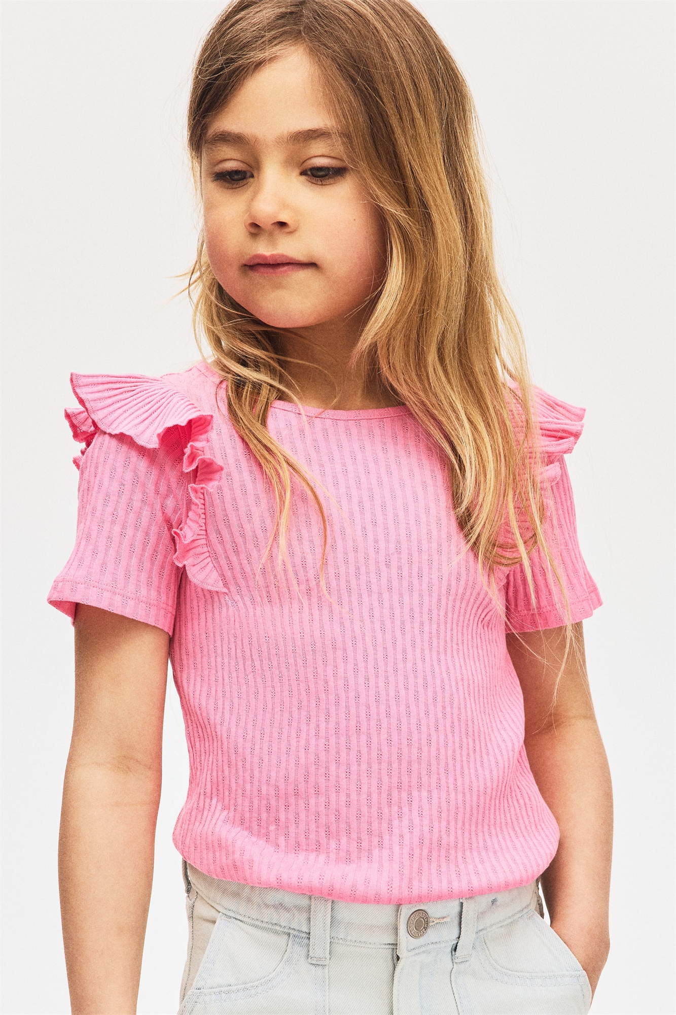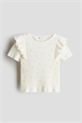 Топ с короткими рукавами из мягкого, ребристого хлопкового джерси с круглым вырезом и воланами на плечах.