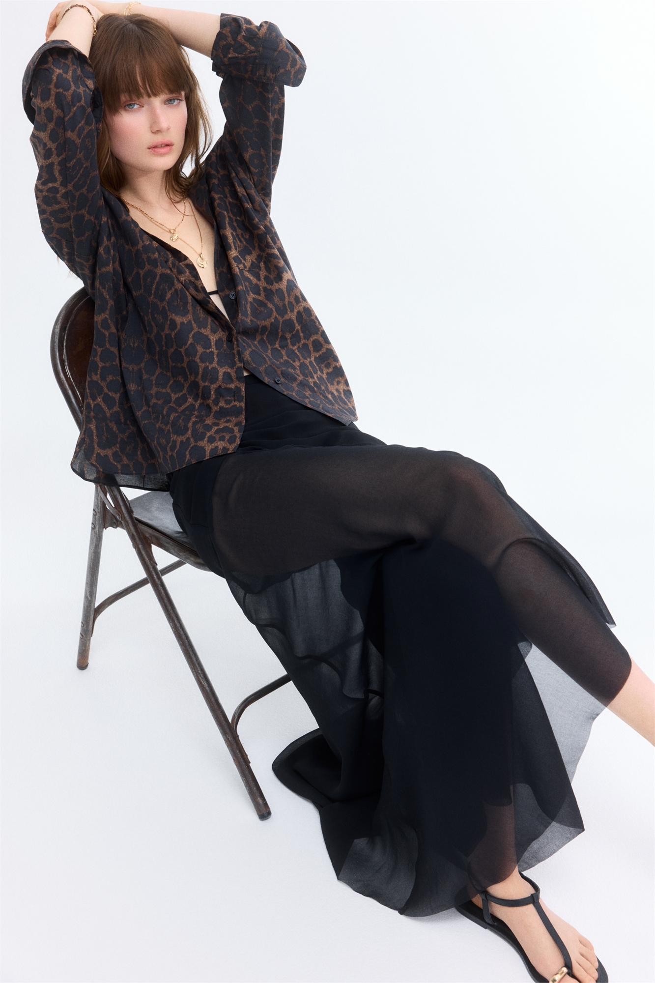 Свободная рубашка из воздушного хлопкового полотна с воротником, застежкой на пуговицы спереди и коромыслом со складками сзади. Накладной нагрудный карман, спущенные плечи, длинные рукава с манжетами на пуговицах.