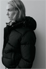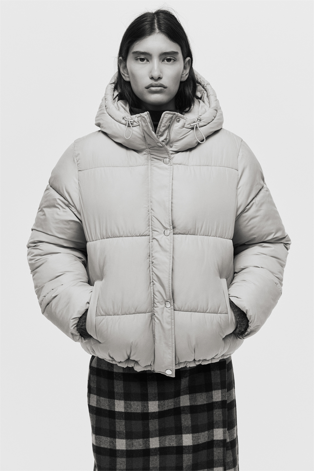 Пуховая куртка из тканого материала с утягивающим капюшоном, застежкой на молнию спереди и ветрозащитной планкой с кнопками. Втачные боковые карманы, скрытая эластичная резинка на манжетах и утягивающий подол. На подкладке.