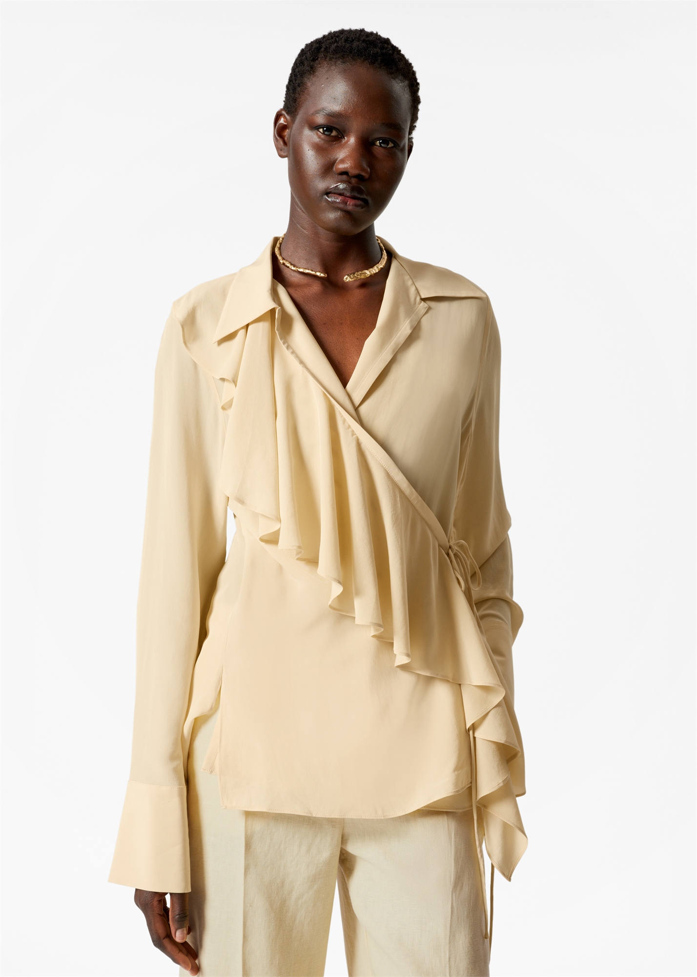 Эта блузка сшита из легкой, эластичной креповой ткани. Блузка выполнена в форме обертки, украшенной каскадной оборкой и закрепленной на талии нежными завязками. Широкий открытый воротник, длинные рукава с манжетами на пуговицах и тонкие разрезы по бокам подола. Длина блузки: 70,5 см / 27,7" (размер S)