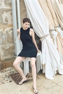 Короткое приталенное платье из мягкого трикотажа с горизонтальными ребрами, украшенное гребешками. Без рукавов, с круглым вырезом и юбкой А-линии.