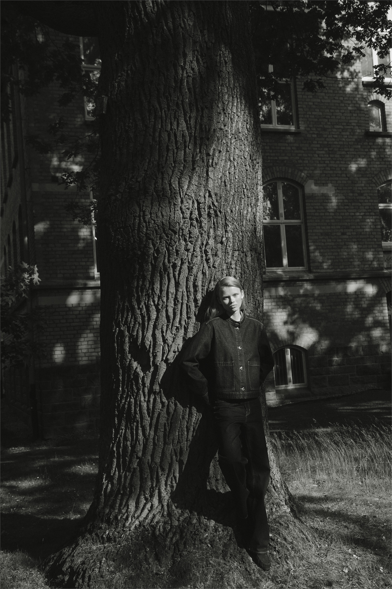 Куртка из хлопковой саржи с воротником-резинкой, пуговицами спереди и накладными передними карманами. Длинные рукава с манжетами на пуговицах и перевернутая складка сзади для придания силуэту А-линии. Без отделки.