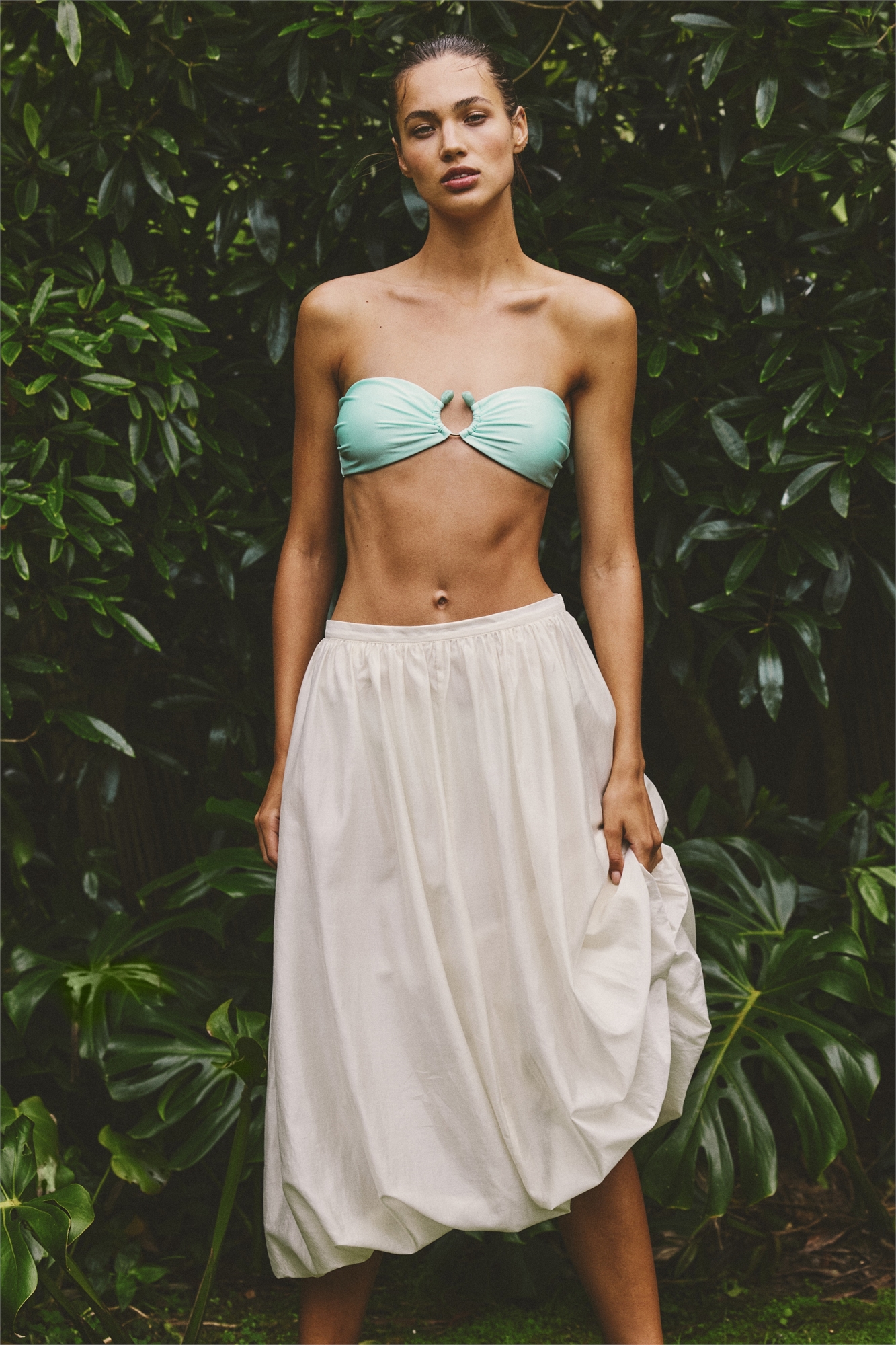 Бикини-бандо на подкладке с чашечками со съемными вкладышами, придающими форму бюсту и обеспечивающими хорошую поддержку. Декоративное открытое металлическое кольцо с бусинами по центру бюста, косточки по бокам и регулируемая застежка-крючок сзади.