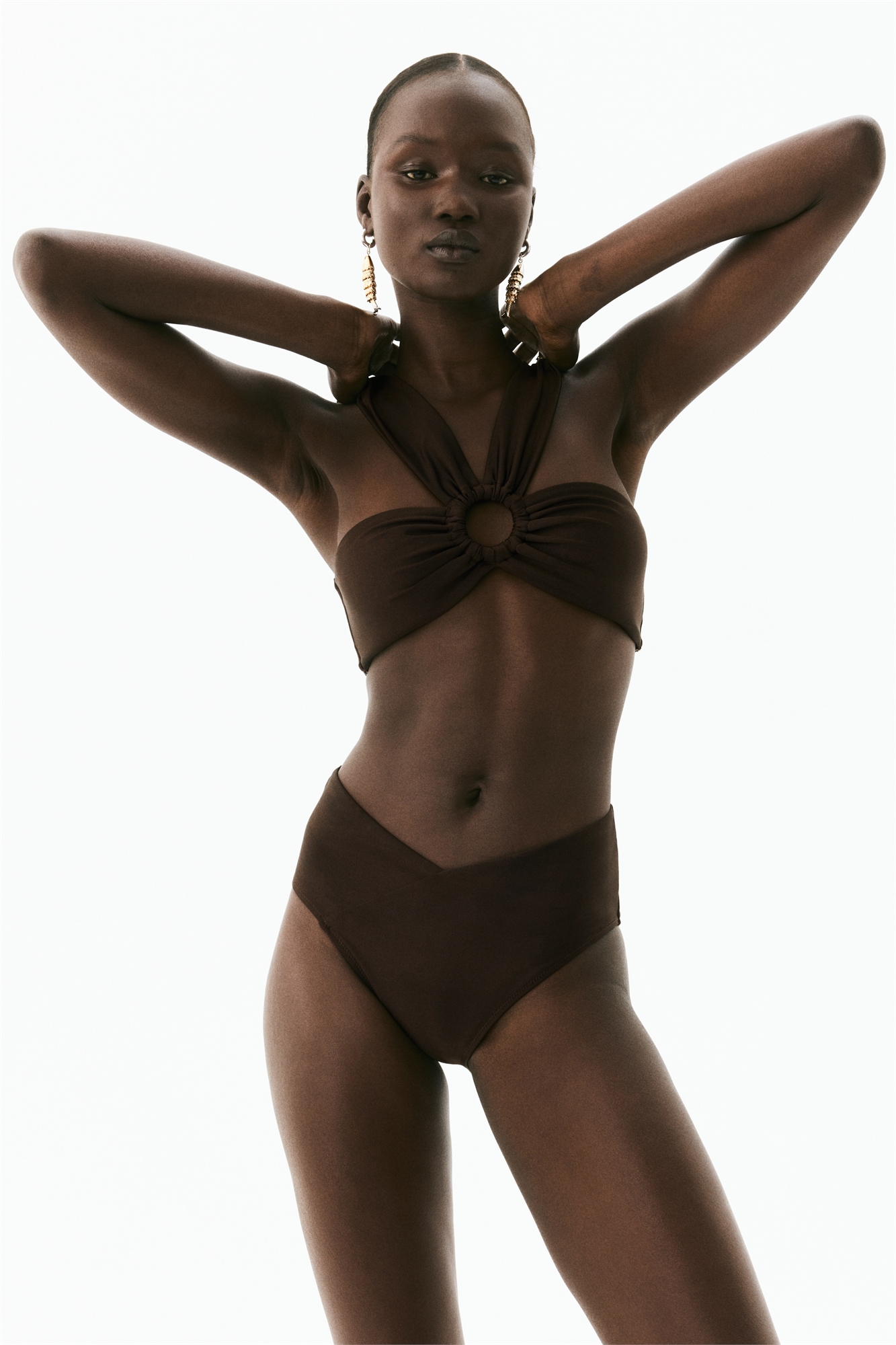 Бикини на подкладке, без проводов, с широкими, собранными на плечах бретелями и закрытым металлическим кольцом спереди. Чашечки со съемными вставками, придающими форму бюсту и обеспечивающими хорошую поддержку. Без застежек.