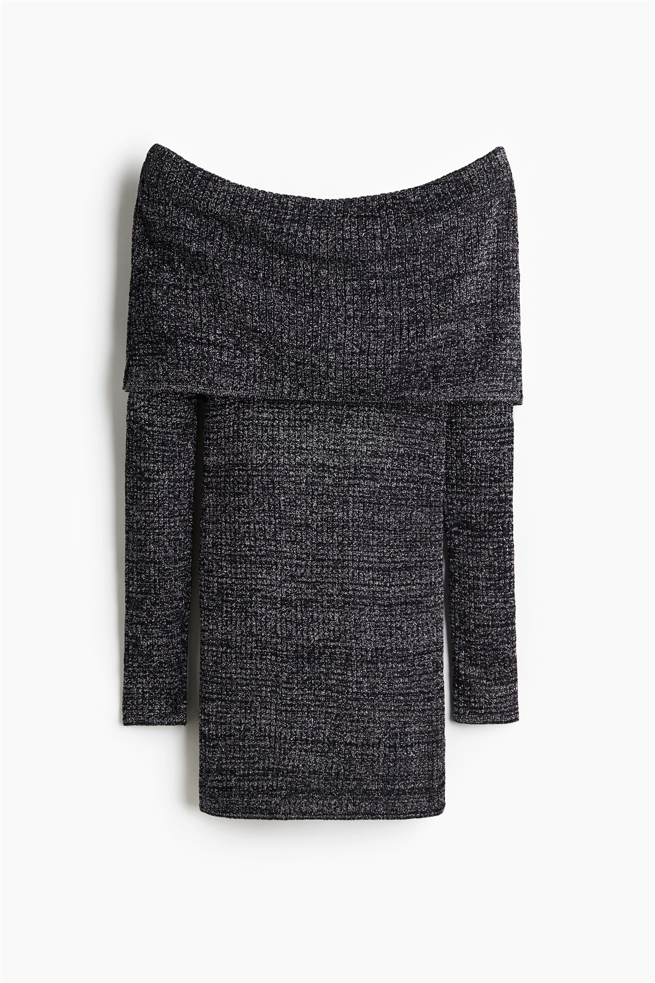 Короткое приталенное платье без плеч из тонкой вискозы в рубчик с блестящими нитями. Широкий отложной верхний край, длинные рукава и прямой подол.
