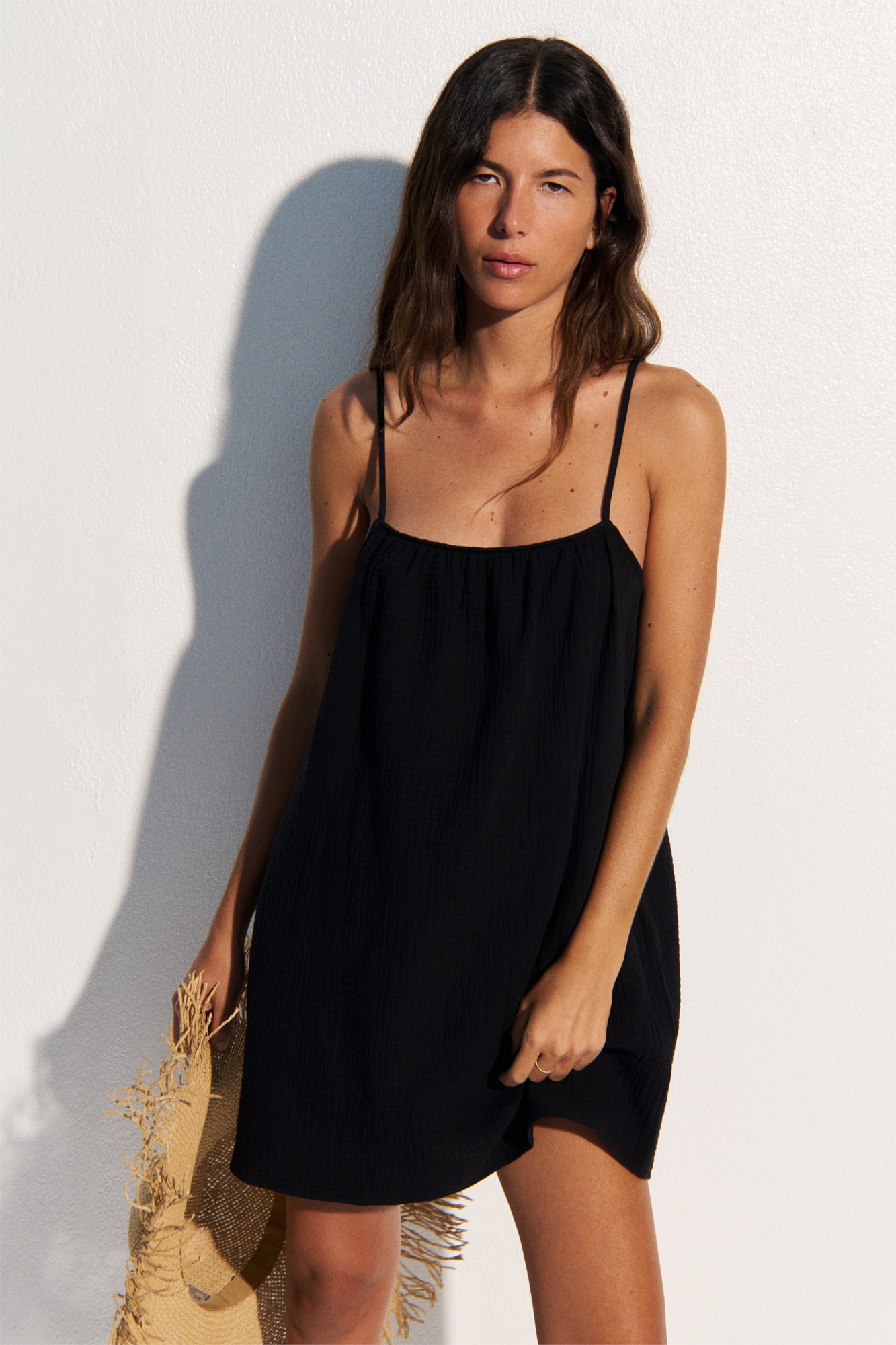 Короткое пляжное платье свободного покроя из мягкого хлопкового муслина с узкими регулируемыми бретелями, прямым вырезом и глубоким круглым вырезом на спине. Без подкладки.