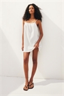 Короткое пляжное платье свободного покроя из мягкого хлопкового муслина с узкими регулируемыми бретелями, прямым вырезом и глубоким круглым вырезом на спине. Без подкладки.