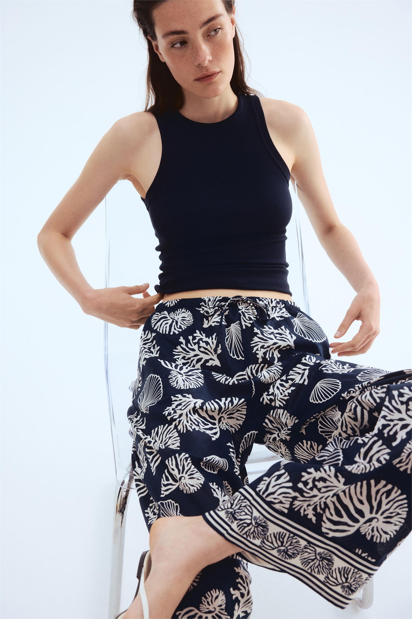 Свободные брюки из воздушного хлопкового полотна с высокой талией с эластичной отделкой и узким шнурком. Небрежные боковые карманы и широкие штанины.