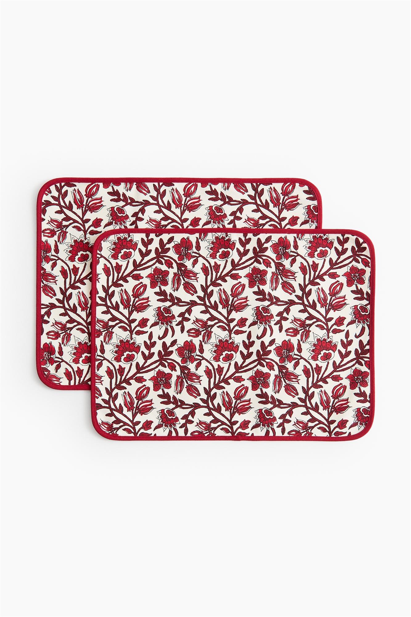 Упаковка из двух двусторонних ковриков с водоотталкивающим покрытием, изготовленных из хлопкового полотна. На одной стороне - красивый узор, на другой - однотонный цвет. Окантовка по краям.