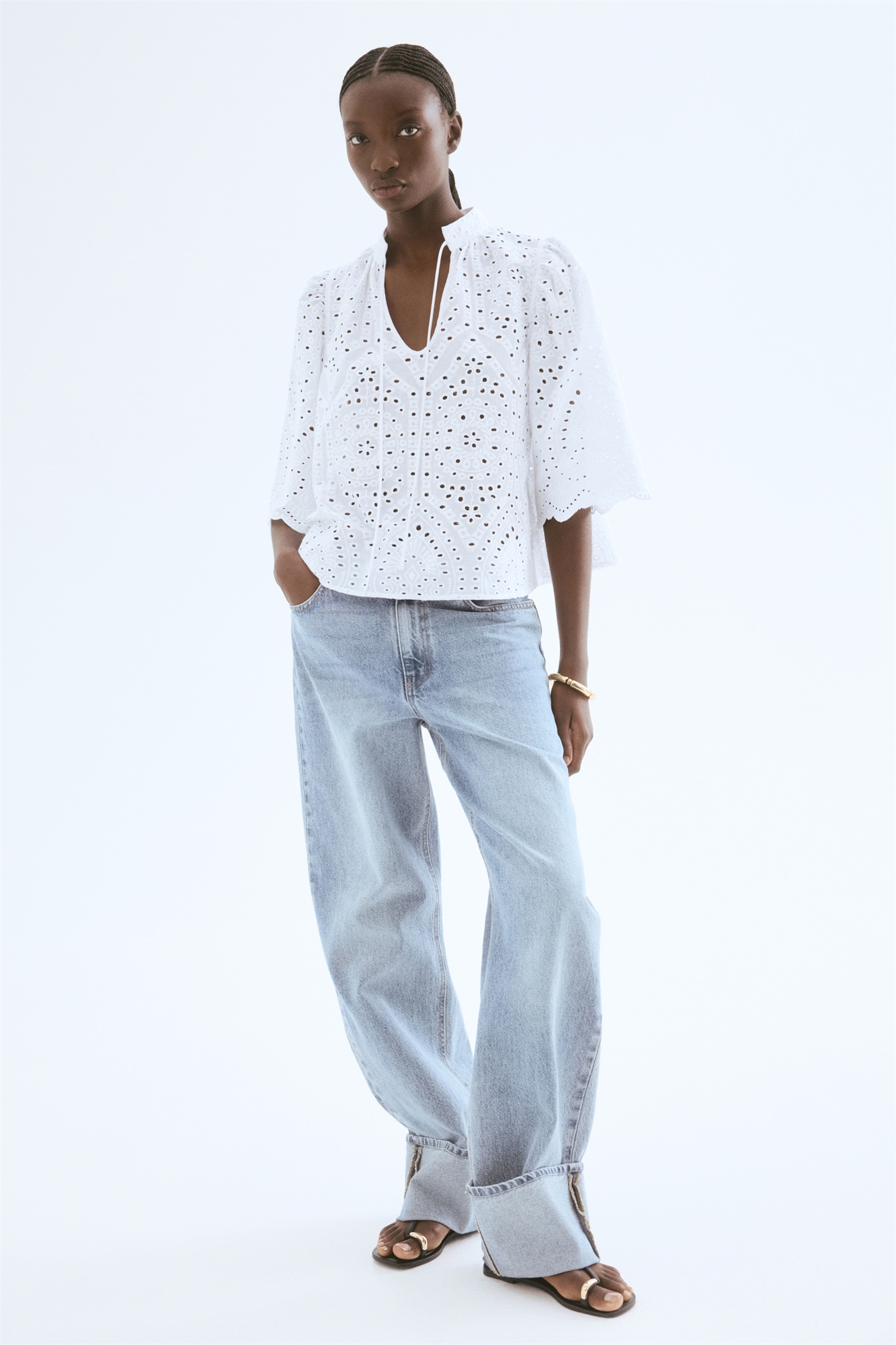 Свободная блузка из воздушного хлопкового полотна с рисунком "бродери англез". Воротник-бант с V-образной проймой и завязками-спагетти спереди. Спинка со складками и рукава длиной до локтя со складками на плечах и обрезными манжетами.