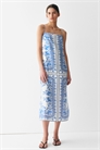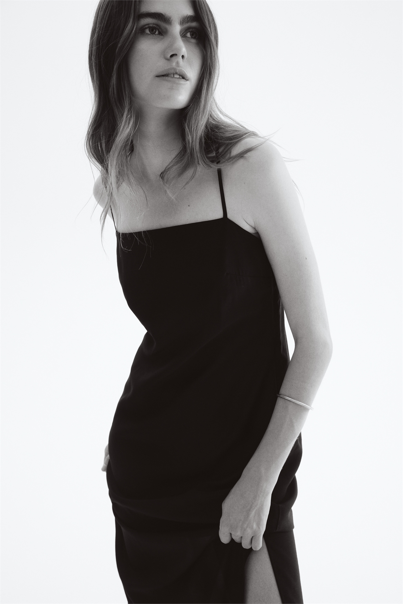 Платье длиной до колен из тканого материала с прямым вырезом и регулируемыми бретелями-спагетти. Вытачки на груди, потайная застежка-молния и застежка-крючок с одной стороны и прямой подол с высоким разрезом с каждой стороны. На подкладке.