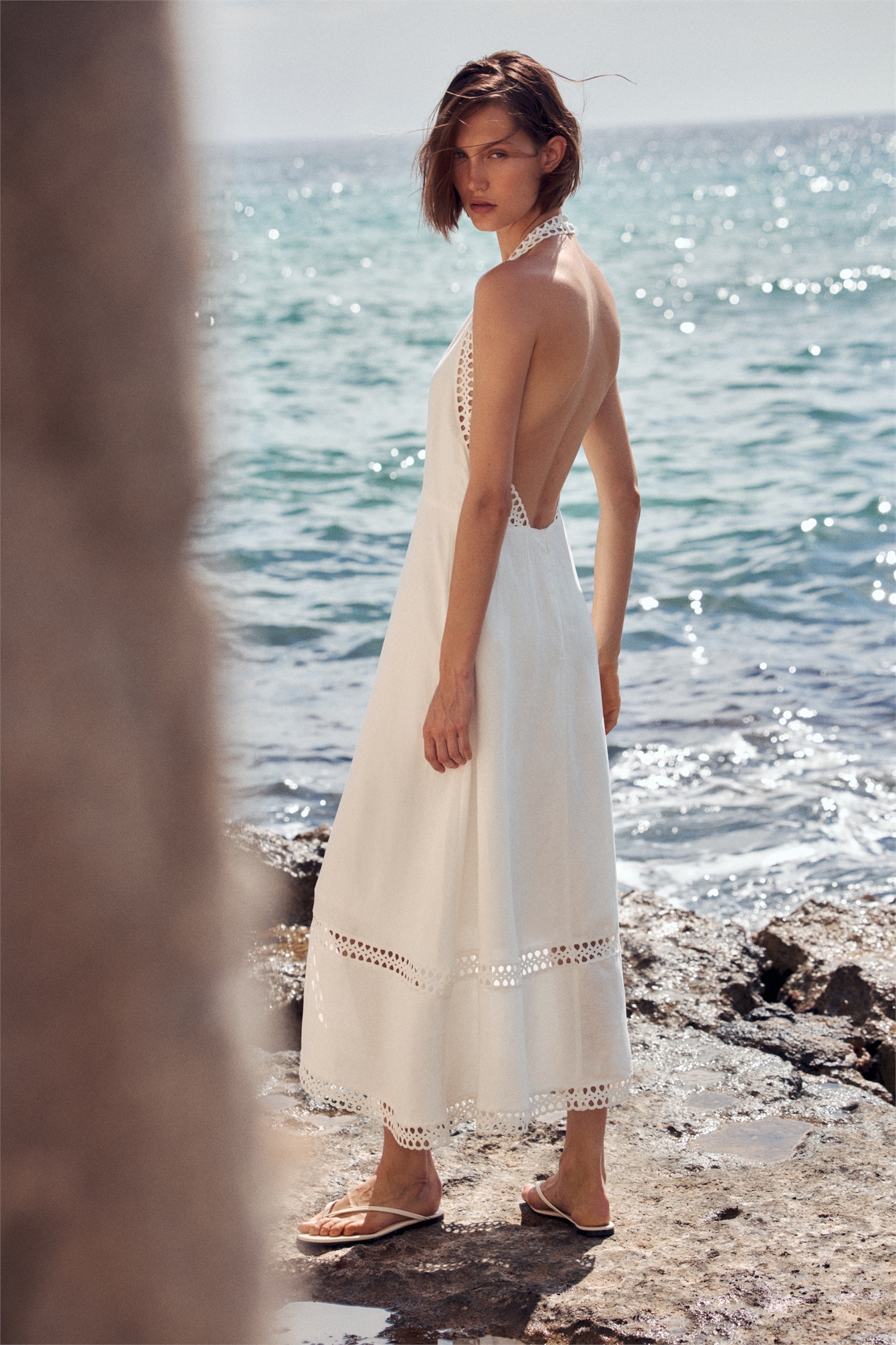 Платье длиной до щиколоток из льна и вискозы с кружевной отделкой и вставками в тон. Застежка на бретелях с закрытыми пуговицами сзади. Приталенный лиф с открытой спиной и потайной застежкой на молнию и крючок-глаз внизу. Расклешенная юбка. Частично на подкладке.