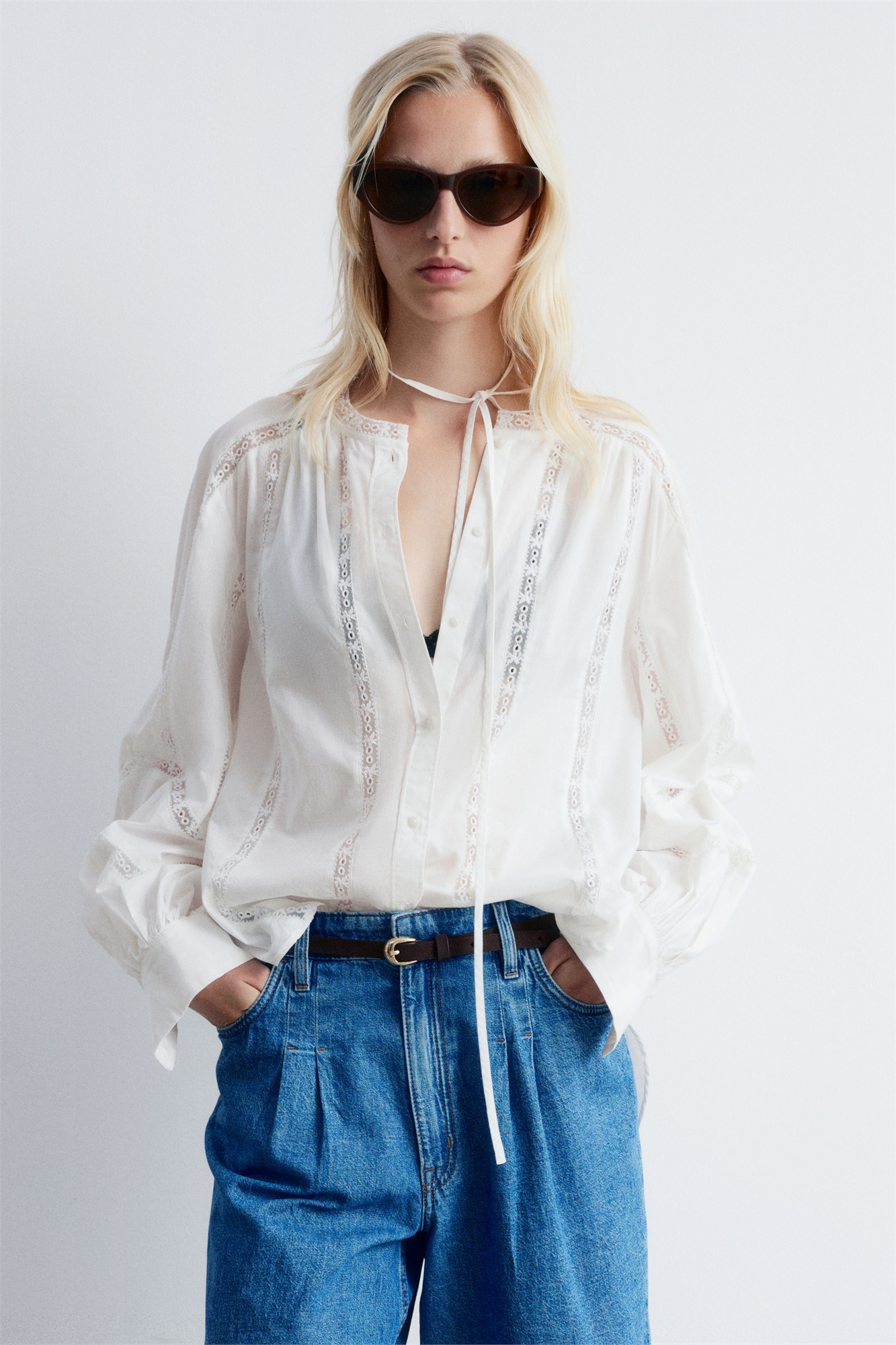 Эта блузка сшита из легкой и воздушной хлопковой ткани. Свободный силуэт, воротник-бант, объемные рукава-баллон с манжетами на пуговицах и нежная кружевная отделка. Спереди застегивается на пуговицы. Заправьте ее в джинсовые шорты в теплые погодные дни или носите свободной, чтобы создать непринужденный, прохладный образ. Длина блузки: 74,5 см / 29,3" (размер S)