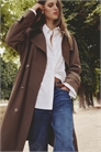 Двубортный тренч длиной до колена из саржи с воротником, застежкой на крючок и глазок и штормовым клапаном на пуговицах спереди. Свободный воротник сзади, втачные боковые карманы, завязывающийся пояс на талии и рукава реглан с манжетами на пуговицах. На подкладке.
