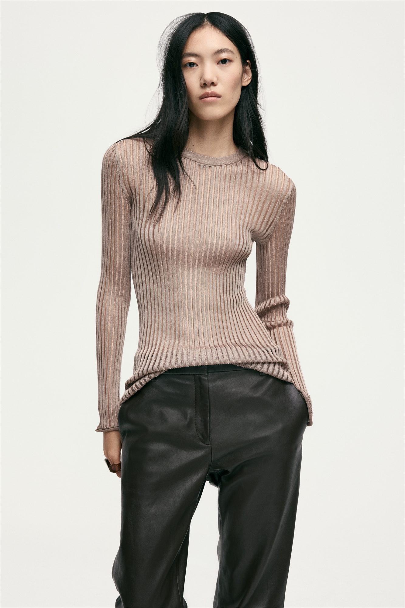 Топ из тонкого трикотажа с круглым вырезом и длинными рукавами. Манжеты и подол отделаны кантом.