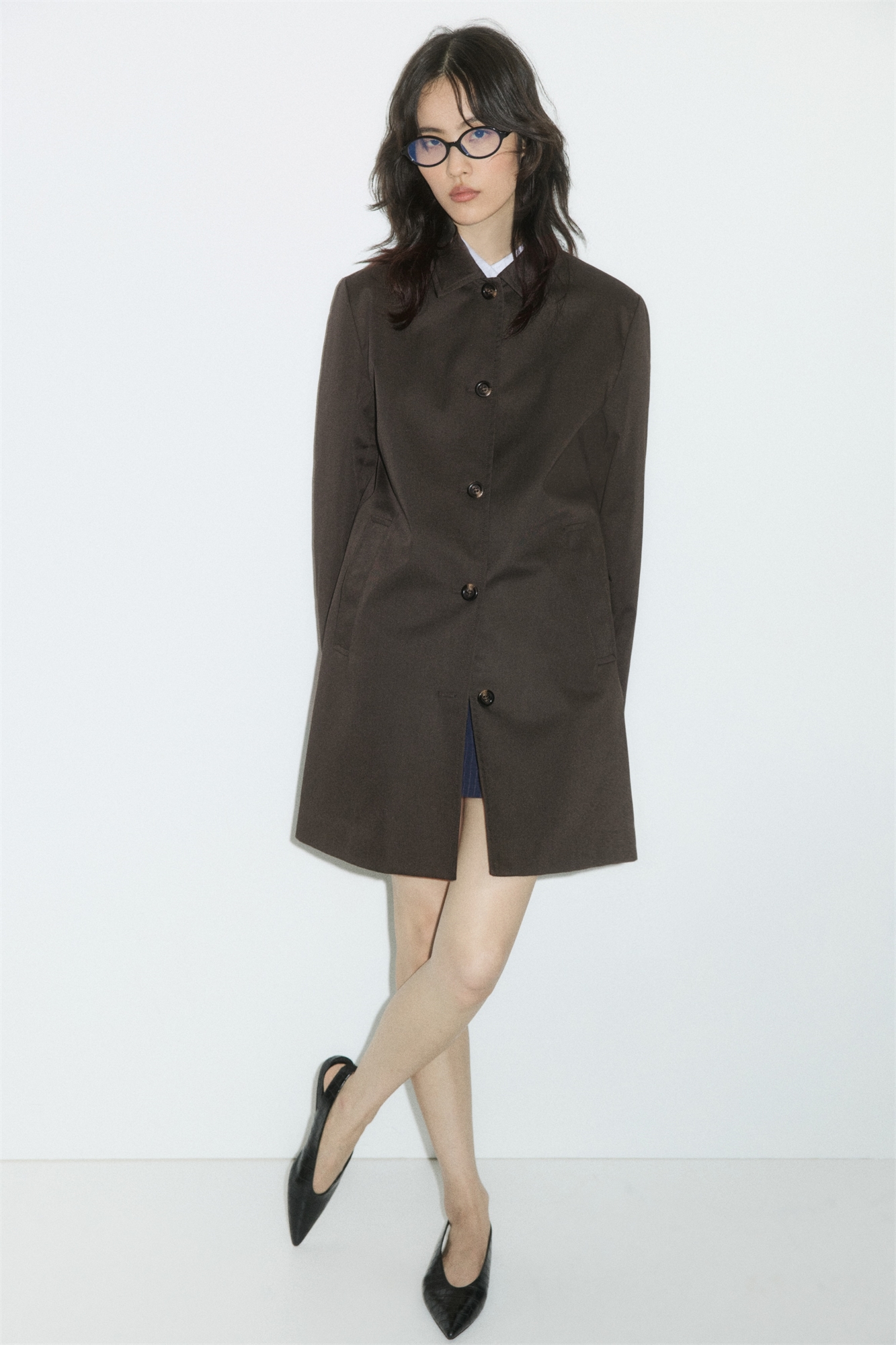 Автомобильное пальто из саржи с воротником, пуговицами спереди и втачными боковыми карманами. На подкладке.