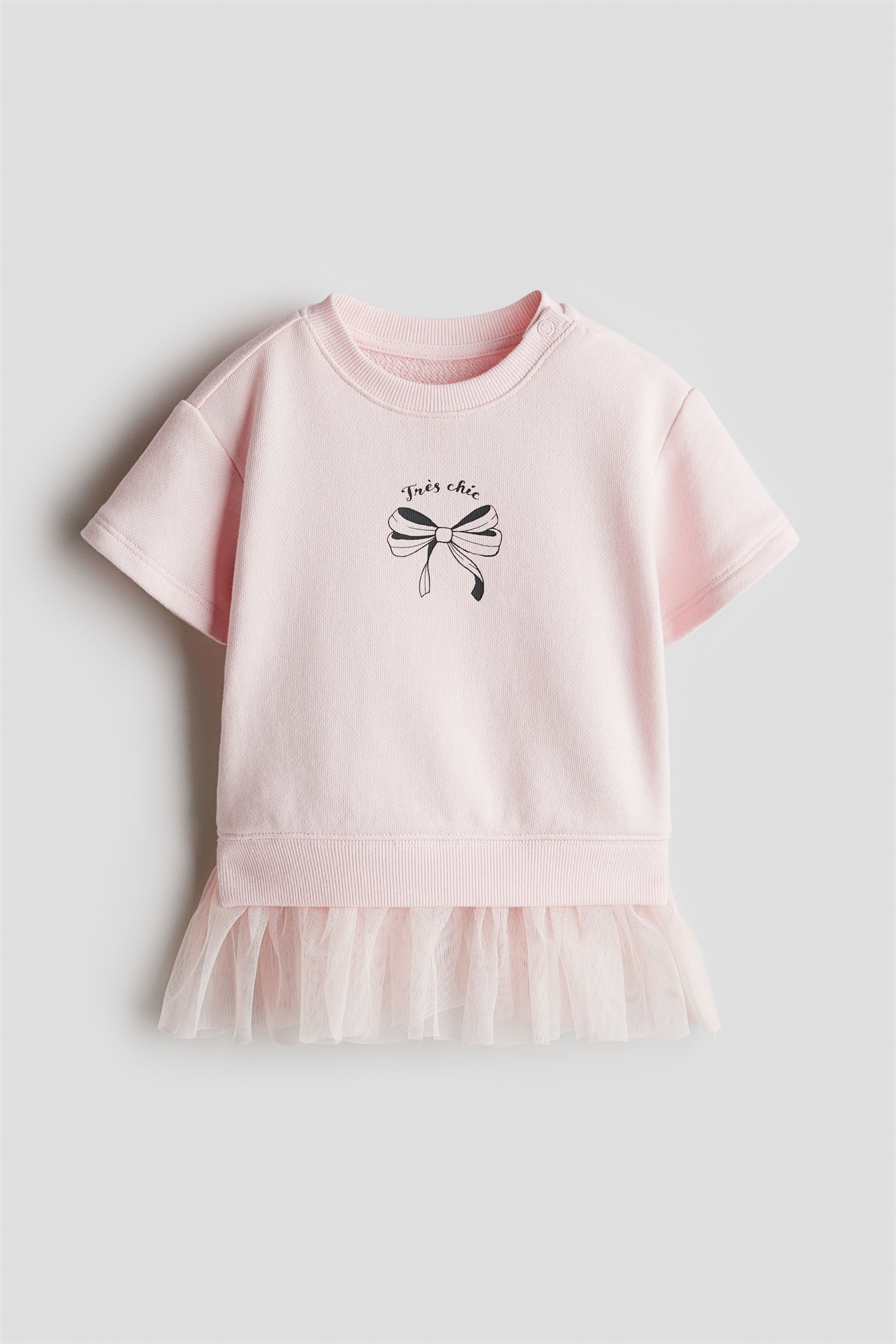Платье из мягкой, легкой ткани свитшот с небольшим принтом спереди и юбкой из тюля. Круглый вырез с ребристой отделкой, застежки с одной стороны (кроме размеров 2-4Y), спущенные плечи и короткие рукава.