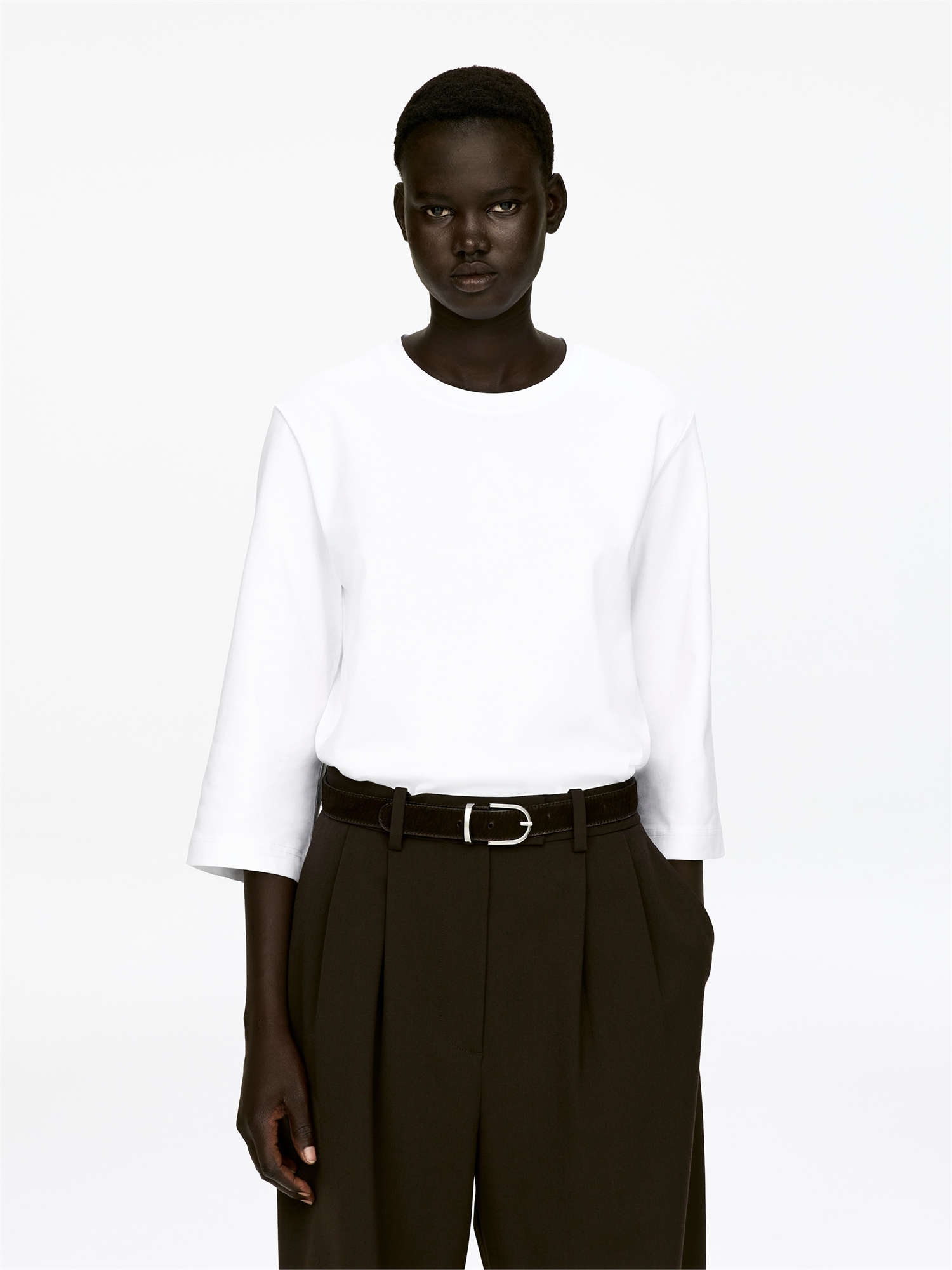 Футболка с вырезом горловины изготовлена из плотного хлопкового джерси. Рукава длиной 3/4.