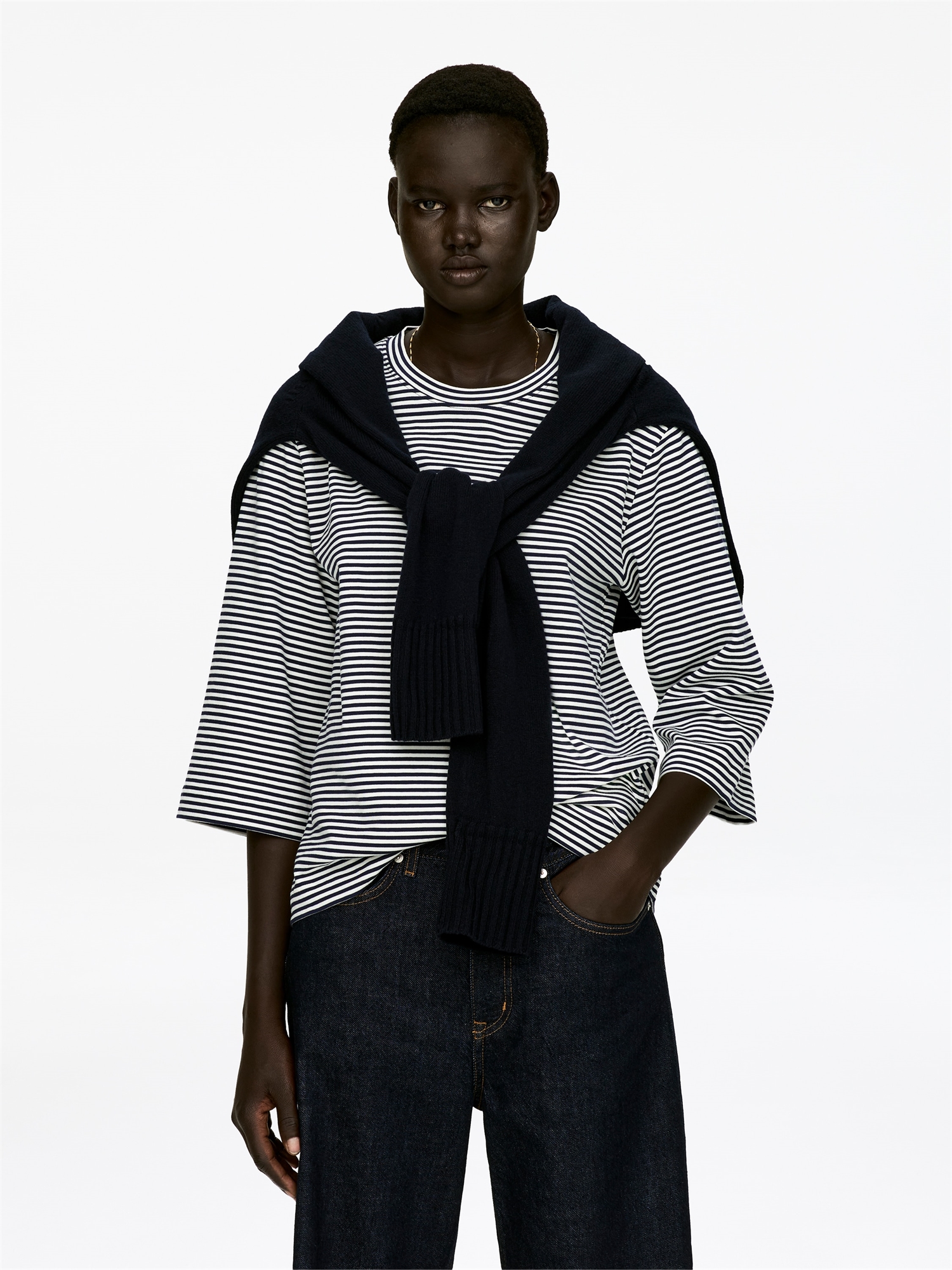 Футболка с вырезом горловины изготовлена из плотного хлопкового джерси. Рукава длиной 3/4.