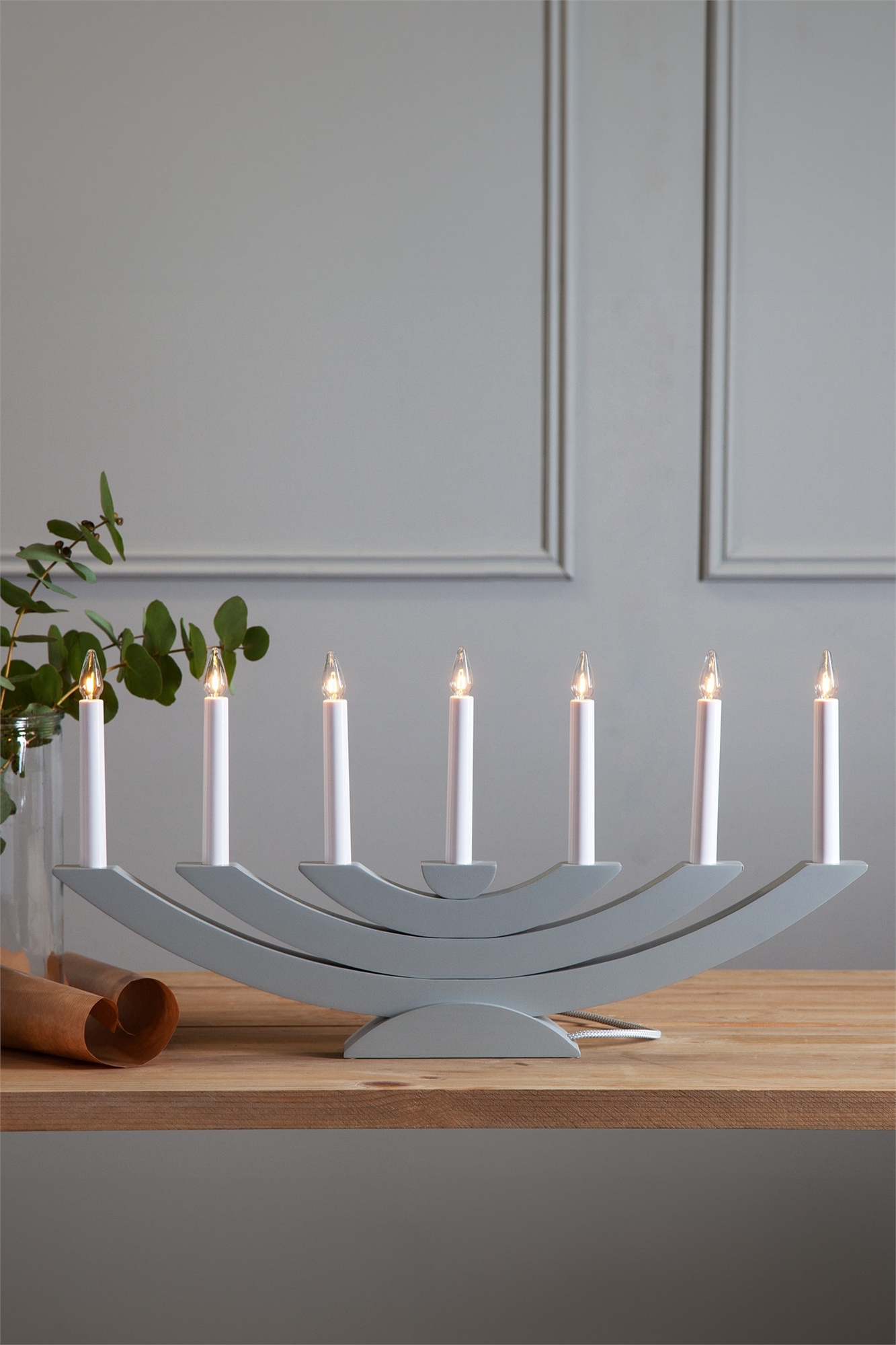 Деревянный адвент-подсвечник с 7 источниками света. Поместите подсвечник, например, в окно, чтобы создать прекрасную атмосферу в вашем доме. Высота 30 см. Ширина 60 см. Длина соединительного кабеля 180 см.