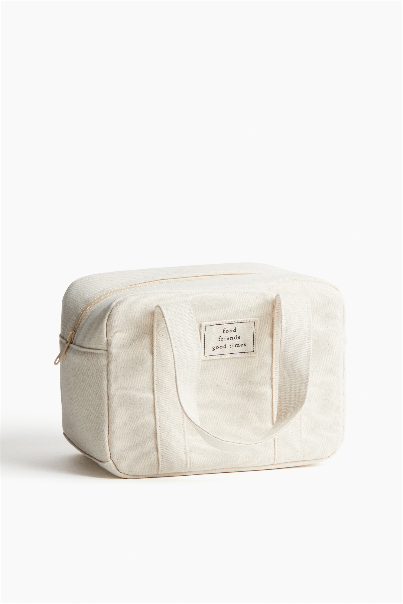 Сохраните содержимое вашего ланч-бокса свежим и вкусным. Удобная в переноске сумка для ланча из хлопкового холста украшена небольшой аппликацией на одной стороне. Застежка-молния и две практичные ручки в верхней части. Изолирующая подкладка из фольги.