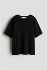 Свободная футболка из мягкого тонкого трикотажа из смеси хлопка и льна. Круглый ребристый вырез с кантом, слегка спущенные плечи и прямой подол.