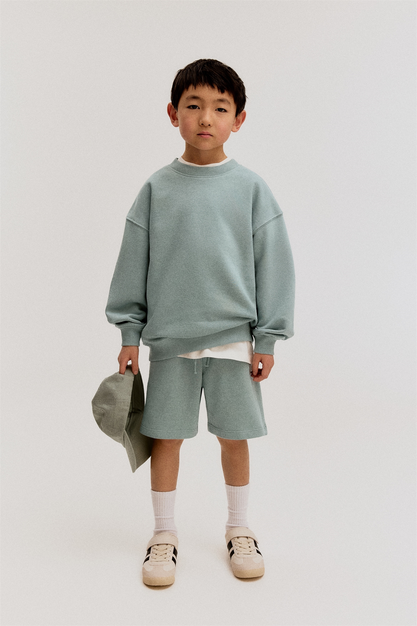 Комплект из топа и шорт из легкого толстовочного материала. Топ с круглым вырезом с ребристой отделкой, спущенными плечами и длинными рукавами. Широкая ребристая отделка на манжетах и подоле. Шорты с эластичной утягивающейся талией и незаметными боковыми карманами.