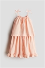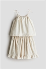 Комплект из топа на бретелях и юбки с воздушным переплетением из смеси льна и хлопка. Расклешенный топ с круглым вырезом и узкими бретелями с пришитым бантом в верхней части. Юбка с эластичной резинкой на талии и оборкой на подоле.
