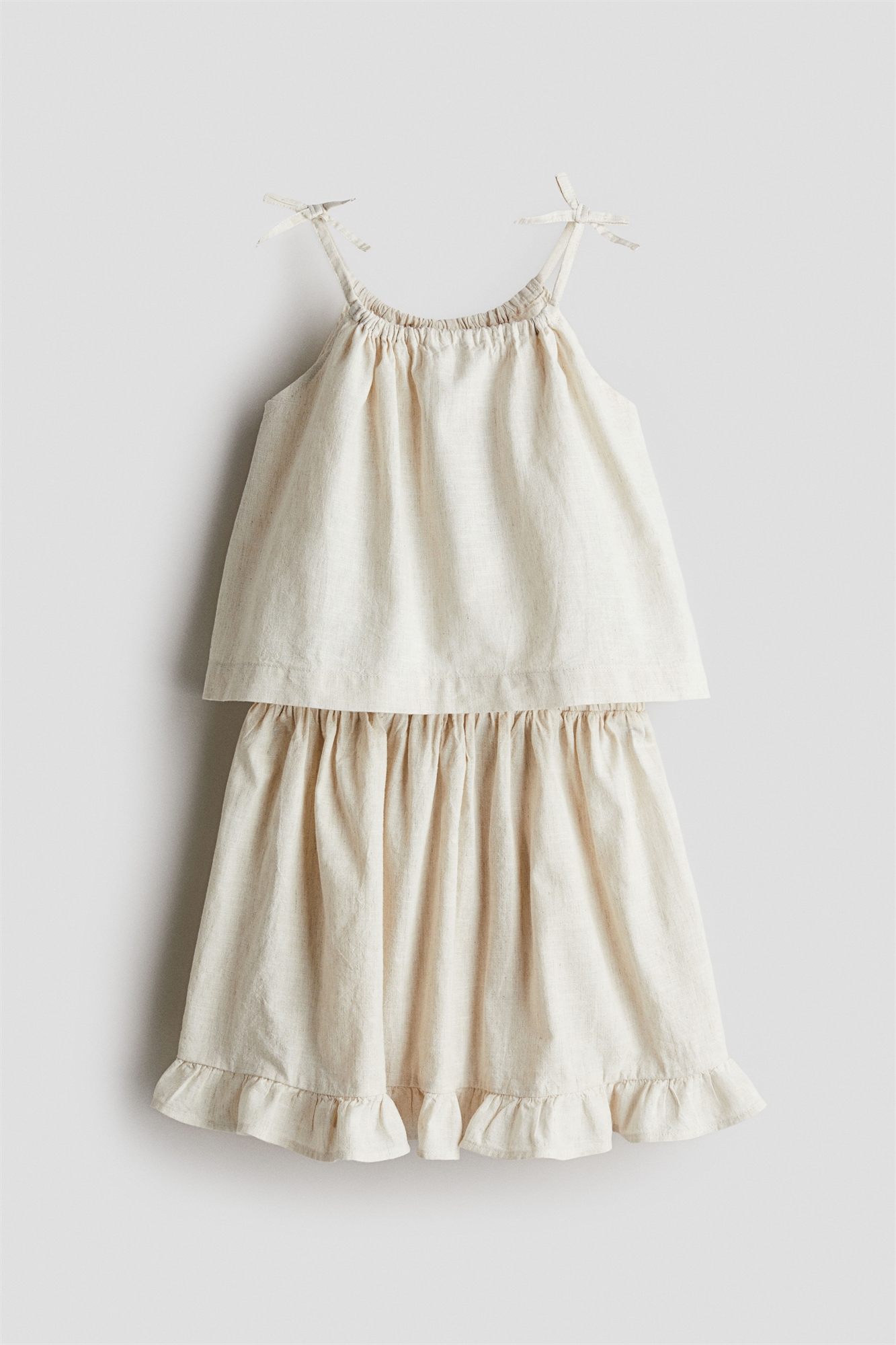 Комплект из топа на бретелях и юбки с воздушным переплетением из смеси льна и хлопка. Расклешенный топ с круглым вырезом и узкими бретелями с пришитым бантом в верхней части. Юбка с эластичной резинкой на талии и оборкой на подоле.