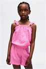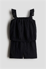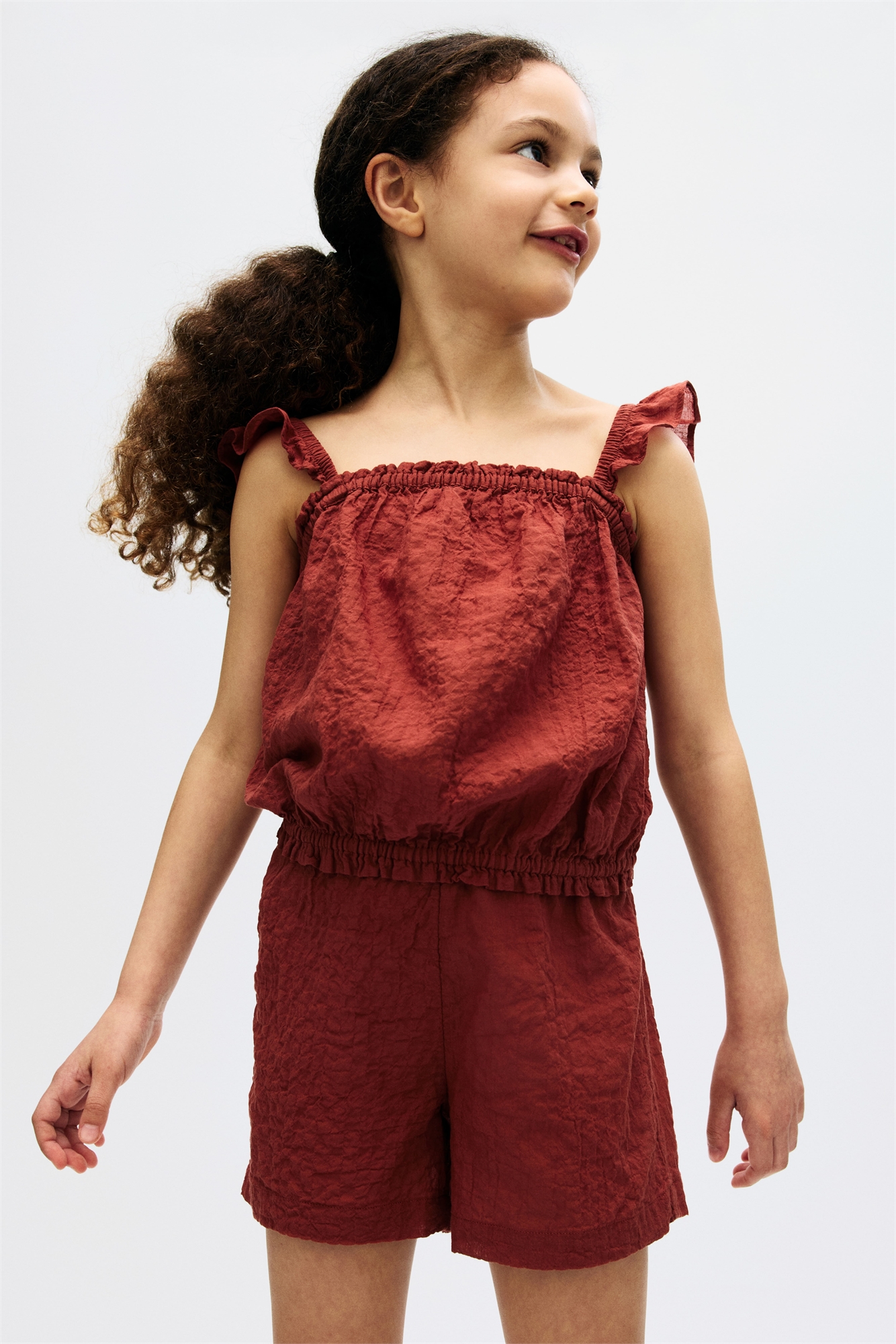Комплект из топа и шорт из махрового хлопка. Топ с бретелями, отделанными воланами, квадратным вырезом, эластичной отделкой и оборкой по верху и подолу. Шорты с эластичной талией с оборкой.