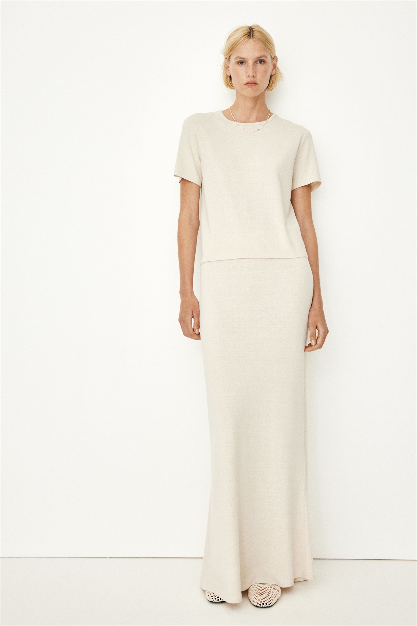 Юбка макси из фактурного джерси, выполненного из смеси шелка и хлопка тутового цвета. Юбка с эластичной резинкой на талии и видимым швом сзади.