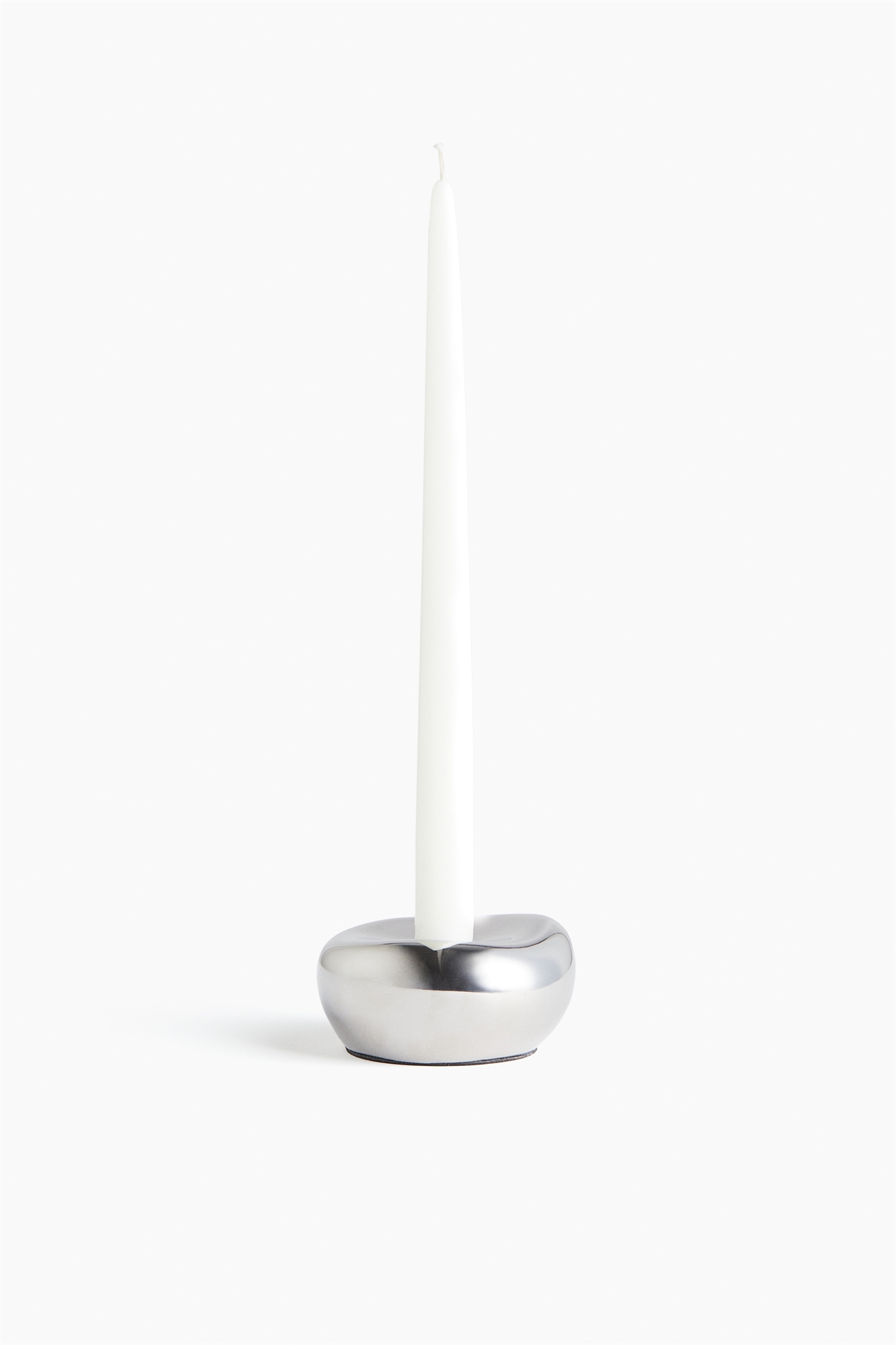 Асимметричный подсвечник из металла с хромированной отделкой и плавными, округлыми контурами, создающими впечатление жидкого серебра.