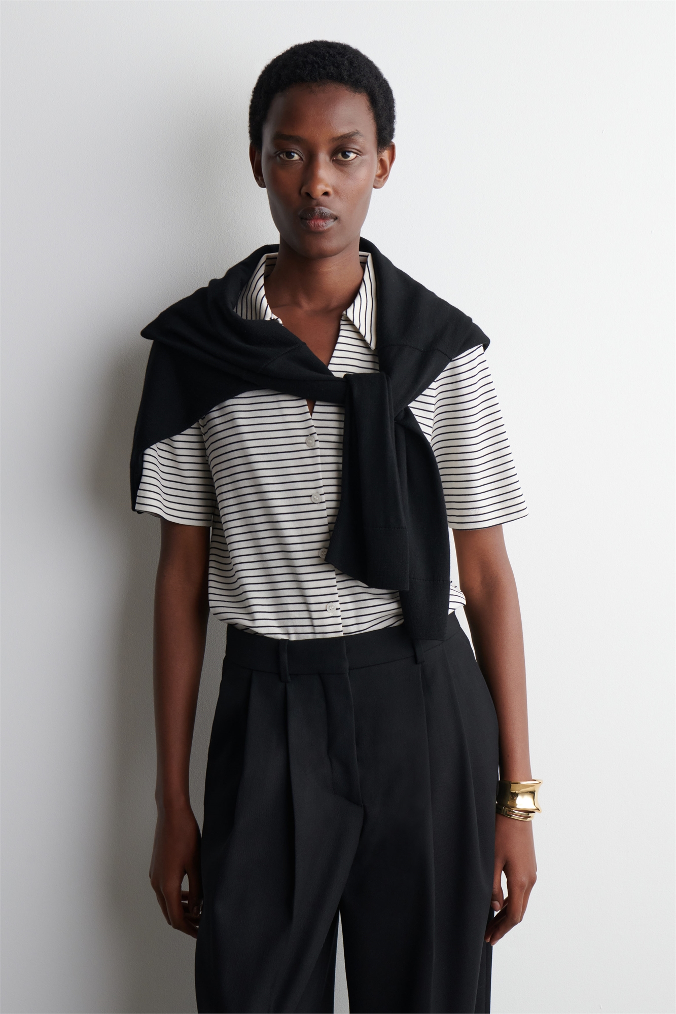 Изысканные силуэты - основа женской коллекции COS. Вдохновленная курортной одеждой, эта современная рубашка сшита из роскошного мягкого хлопка-джерси и имеет облегающий силуэт с заостренным воротником и глубоким вырезом. Насыщенный оттенок эспрессо придает ей легкость. Узкий кройЗастежка на пуговицы Материал: 100% хлопок. Без учета отделки / Машинная стирка Длина по спинке для размера S составляет 60 см / Модель носит размер S