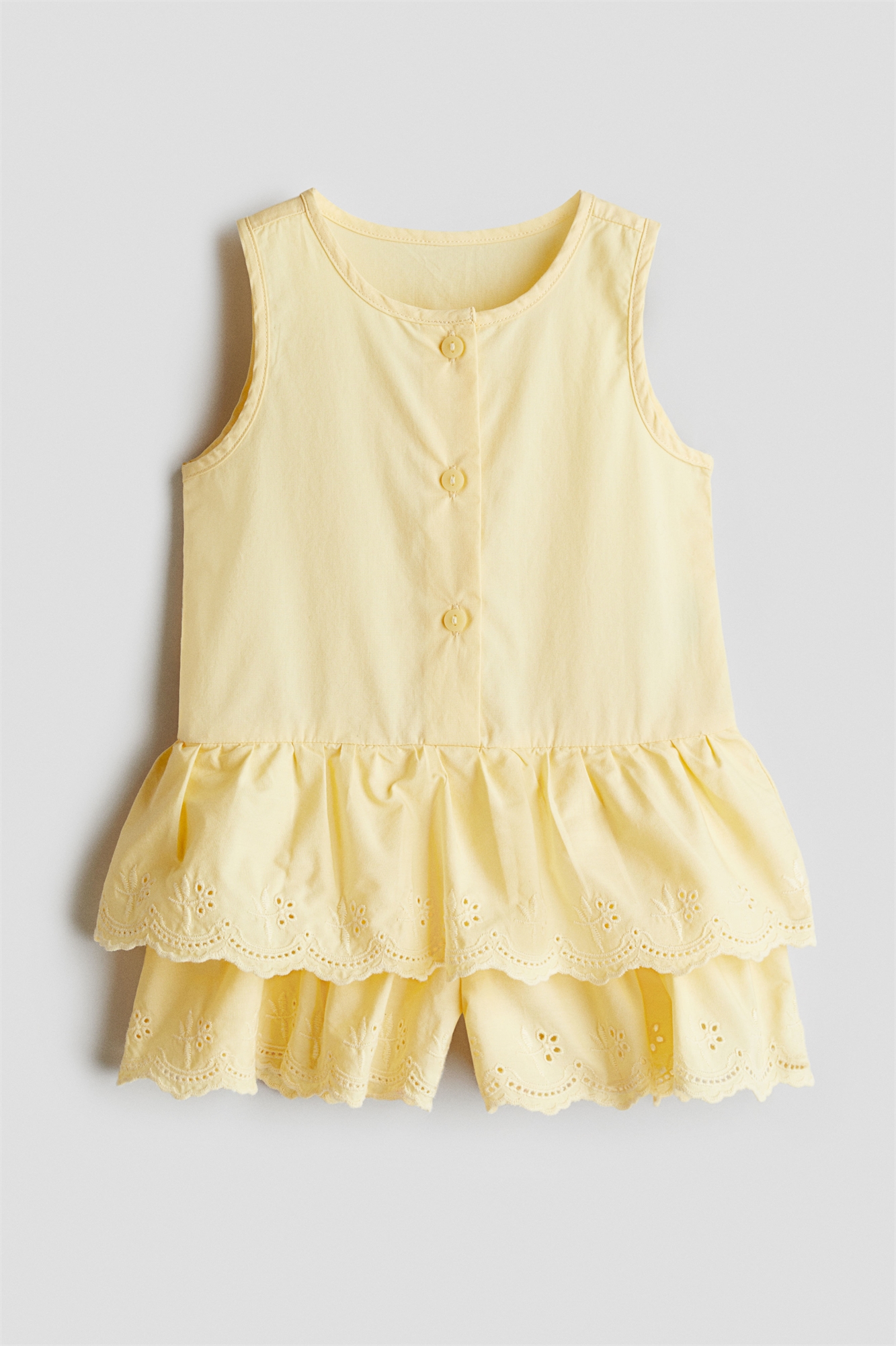 Костюм-ромпер без рукавов из воздушного хлопкового полотна с рисунком broderie anglaise. Круглый вырез, пуговицы спереди и сборчатый шов с воланом на талии. Короткие ножки с обшлагами.
