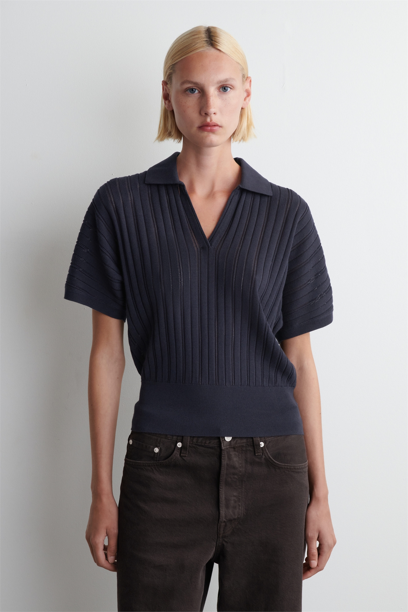 Эта рубашка-поло из хлопка с пуантелью, выполненная в изысканной простоте, отличается стойким темно-синим оттенком. Она имеет открытый воротник, рукава "летучая мышь" и широкий подол, который аккуратно сидит на талии, создавая непринужденный, но четкий силуэт. Свободный крой Материал: 100% хлопок. Без учета отделки / Машинная стирка Длина по спинке для размера S составляет 58 см / Модель носит размер S