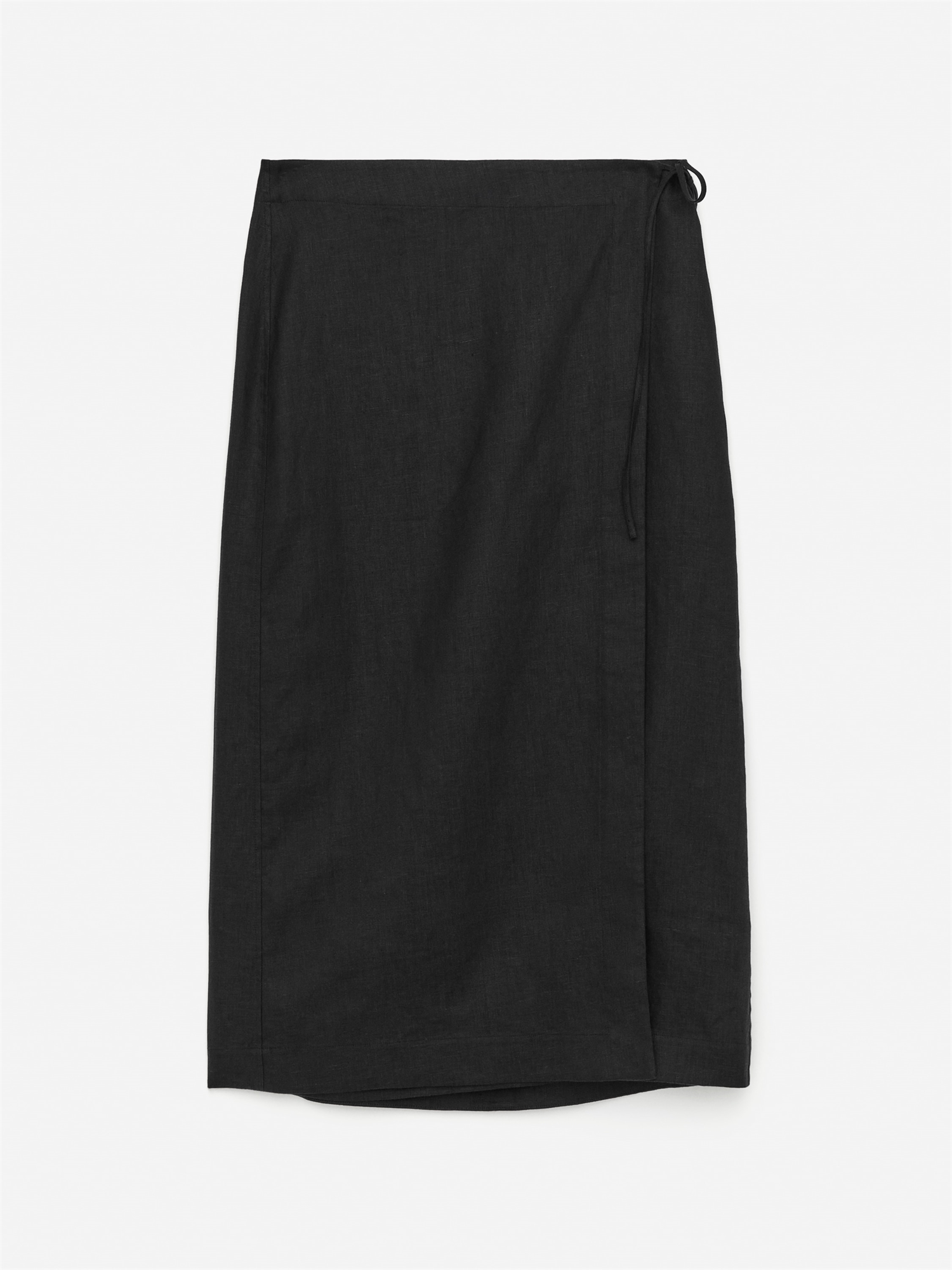 Юбка средней длины из льна. Завязка на талии. Обычный крой.