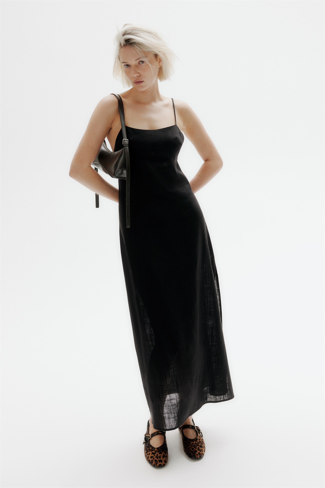 Облегающее платье макси из тканого материала с квадратным вырезом, отвесной спинкой и регулируемыми бретелями-спагетти, которые продеваются в петли и завязываются сзади. Скрытая застежка-молния с одной стороны лифа и высокий разрез на подоле. Частично на подкладке.