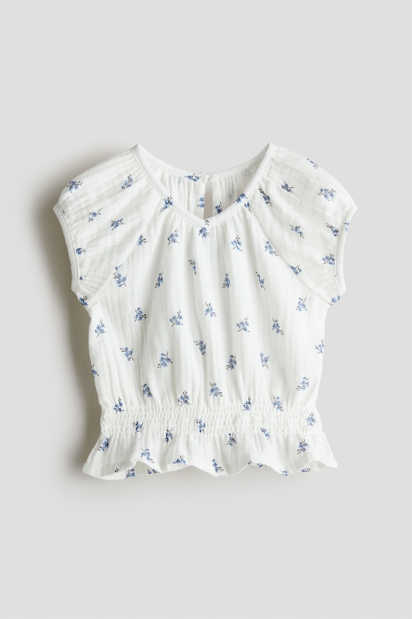 Топ из мягкого хлопкового муслина с круглым вырезом, отверстием для ключа с пуговицей сзади и короткими рукавами реглан. Отделка платочной вязкой с оборкой по подолу.