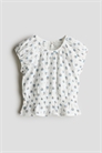 Топ из мягкого хлопкового муслина с круглым вырезом, отверстием для ключа с пуговицей сзади и короткими рукавами реглан. Отделка платочной вязкой с оборкой по подолу.