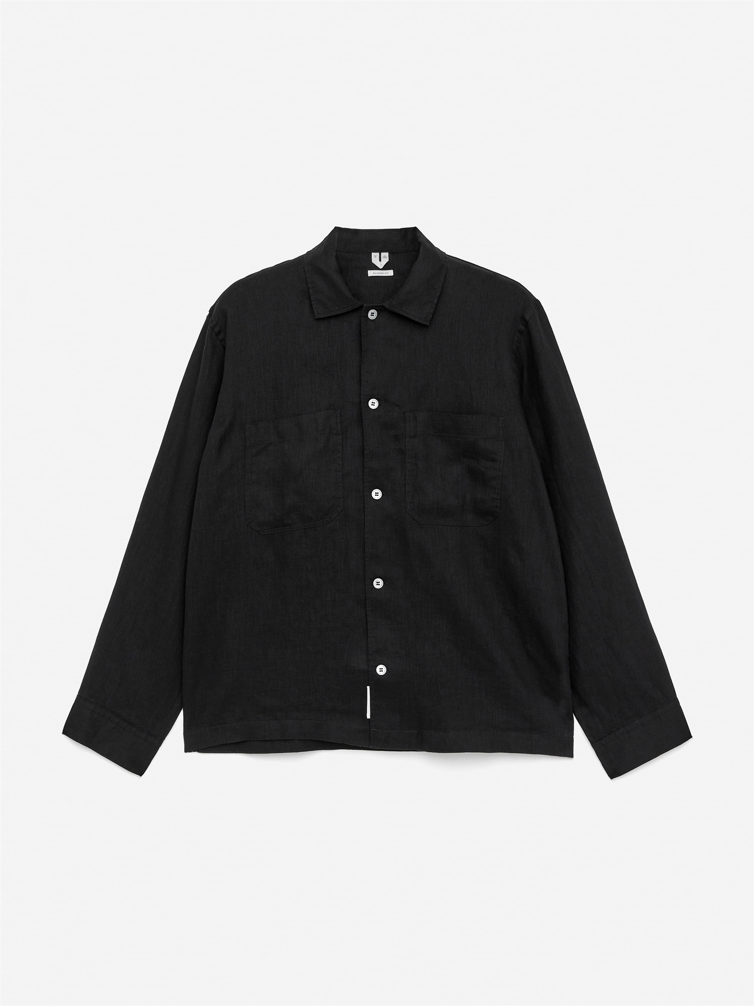 Льняная рубашка с длинными рукавами, нагрудными карманами и свободным кроем.