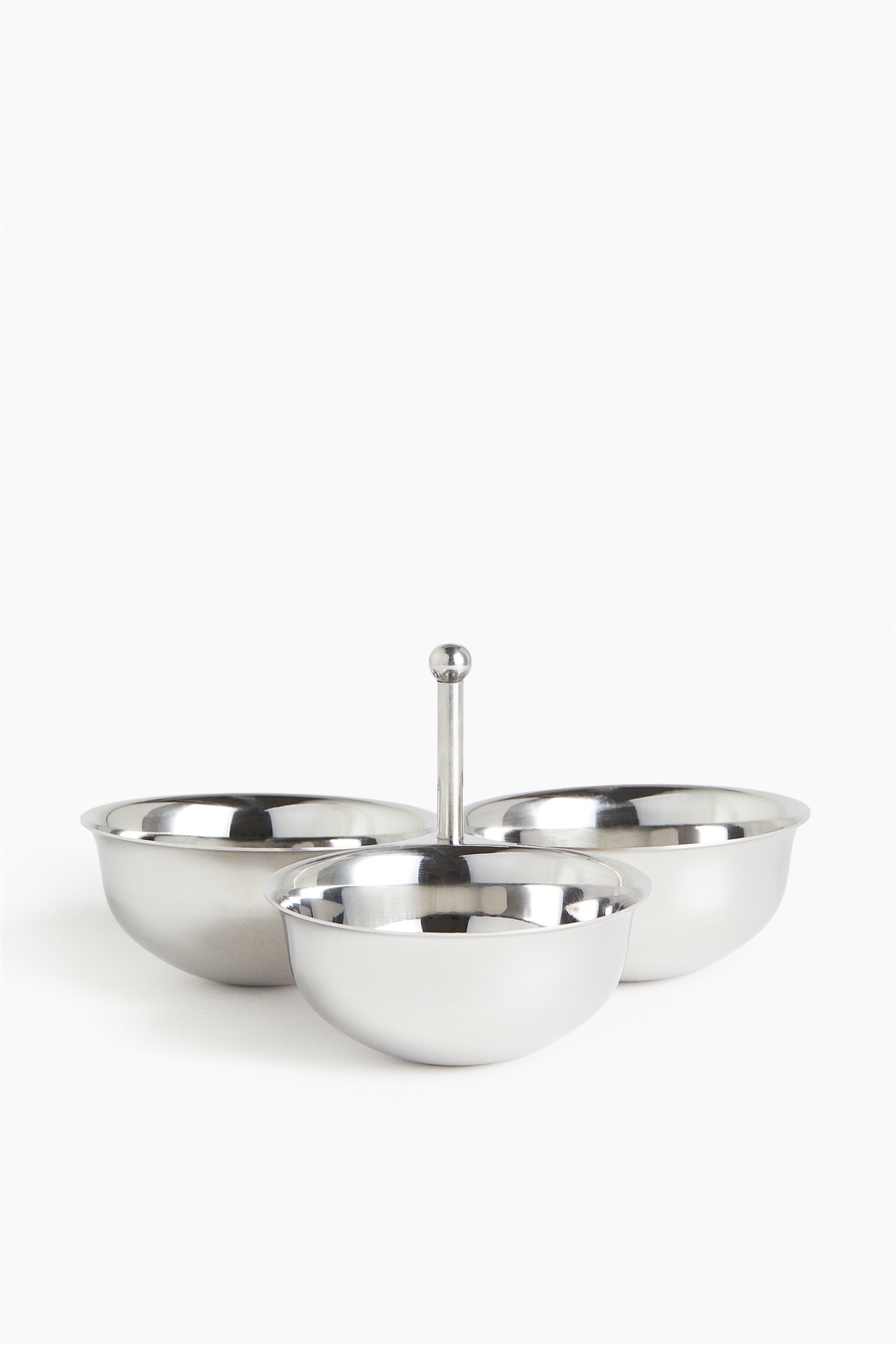 Тройная сервировочная чаша из нержавеющей стали идеально подходит для подачи закусок, таких как орехи, оливки и чипсы, на светских раутах. Легко переносится и подходит к любому стилю оформления. Диаметр одной чаши 10,5 см. Общая ширина 21 см.
